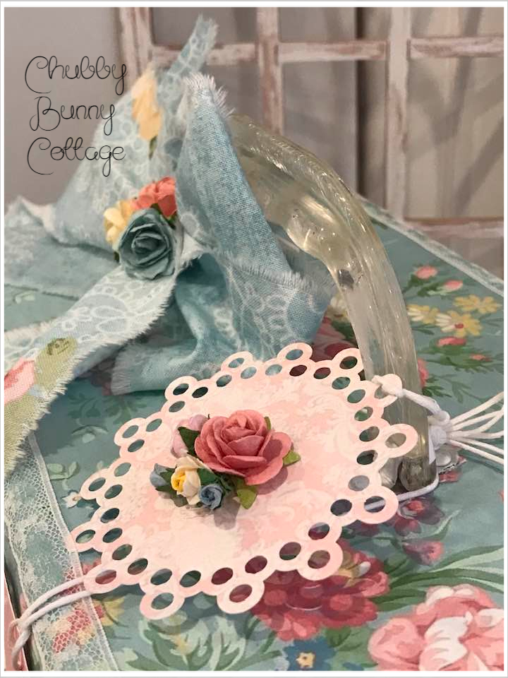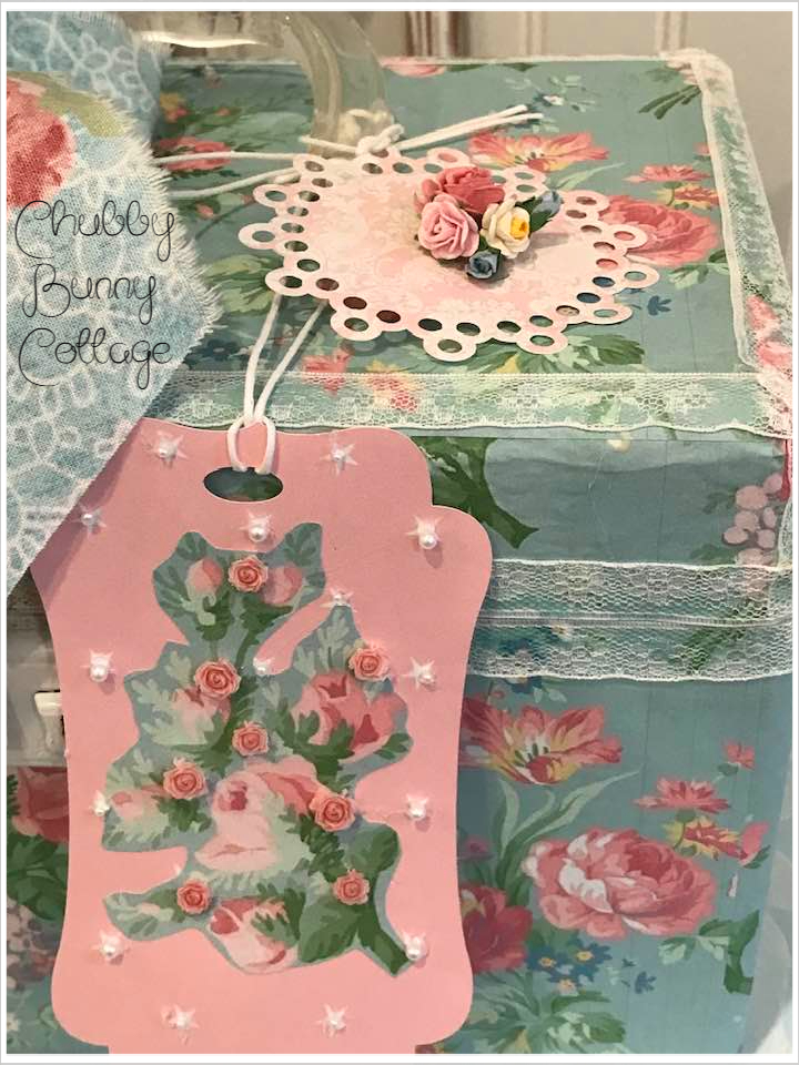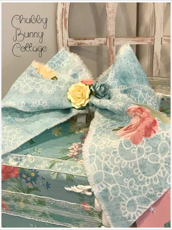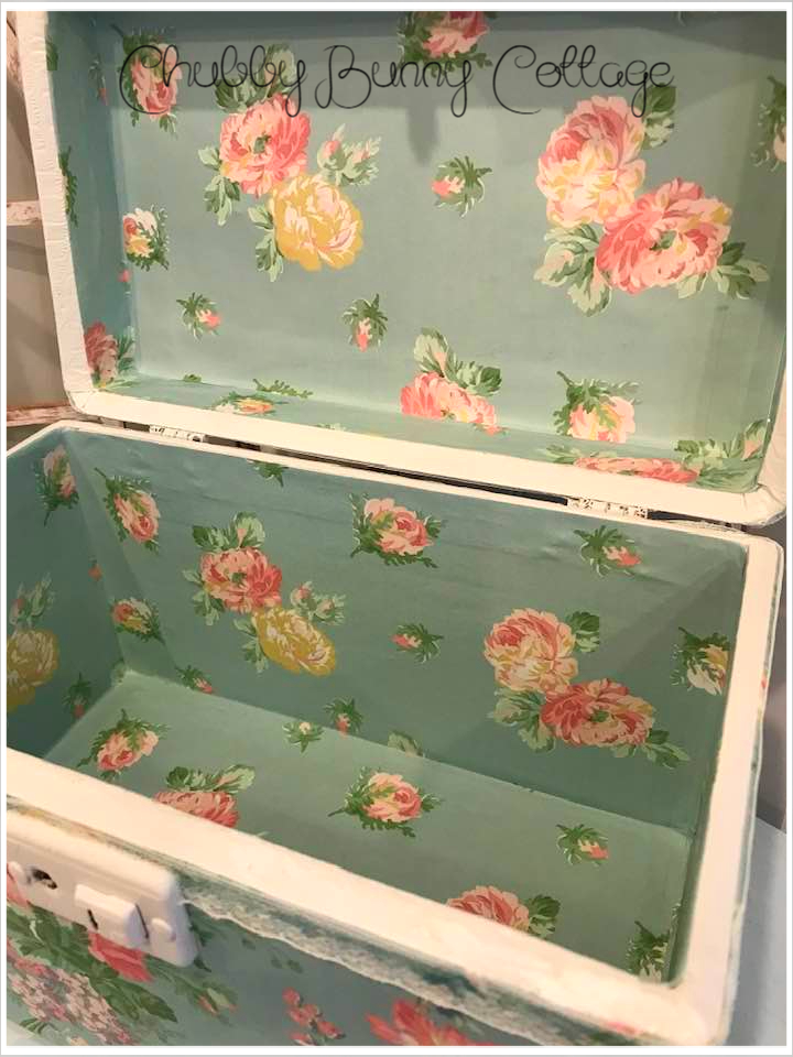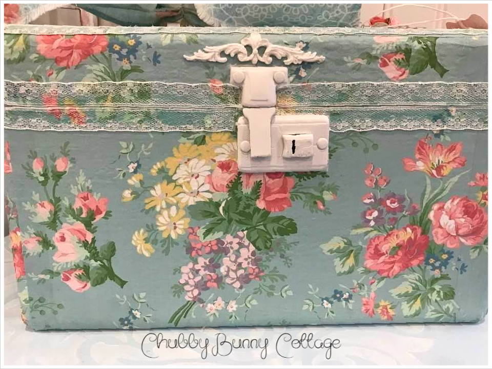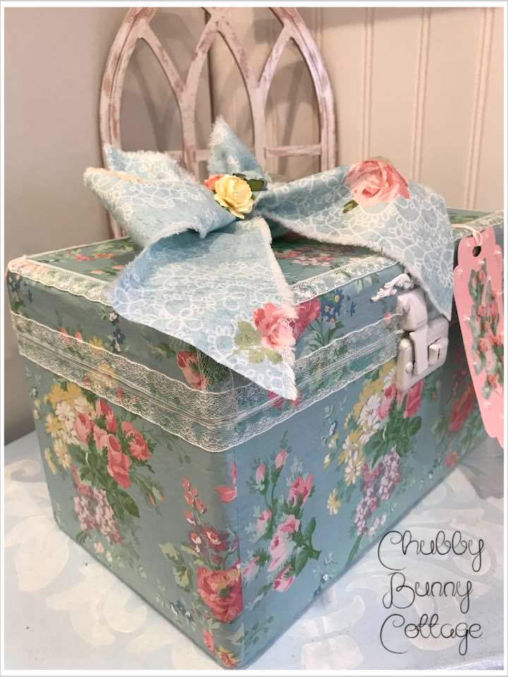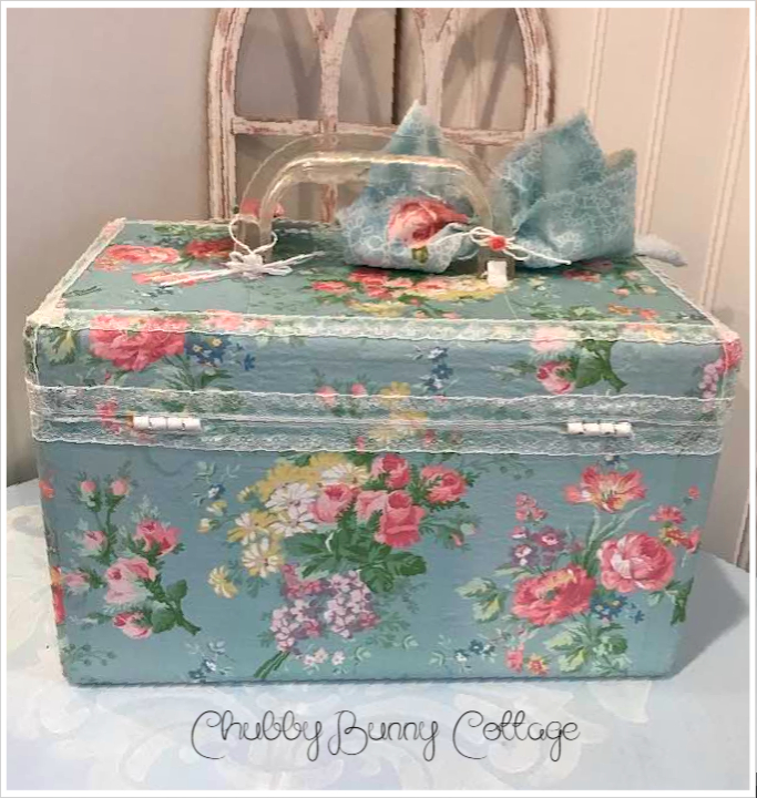 This vintage case is covered with a light blue with pastel bouquets paper. it has a clear bakelite handle. it is lined on the inside with a companion print. it has a rag ribbon bow with paper roses. it has 2 of my tags tied on with a white string and are removable. it is edged around the top with a small white lace and a small cartouche above the lock. the lock does latch but it does not lock. there is not a key. it measures 11 1/4″ wide x 6 1/2″ deep and is 7″ tall. vintage/refurbished/handmade/one of a kind.