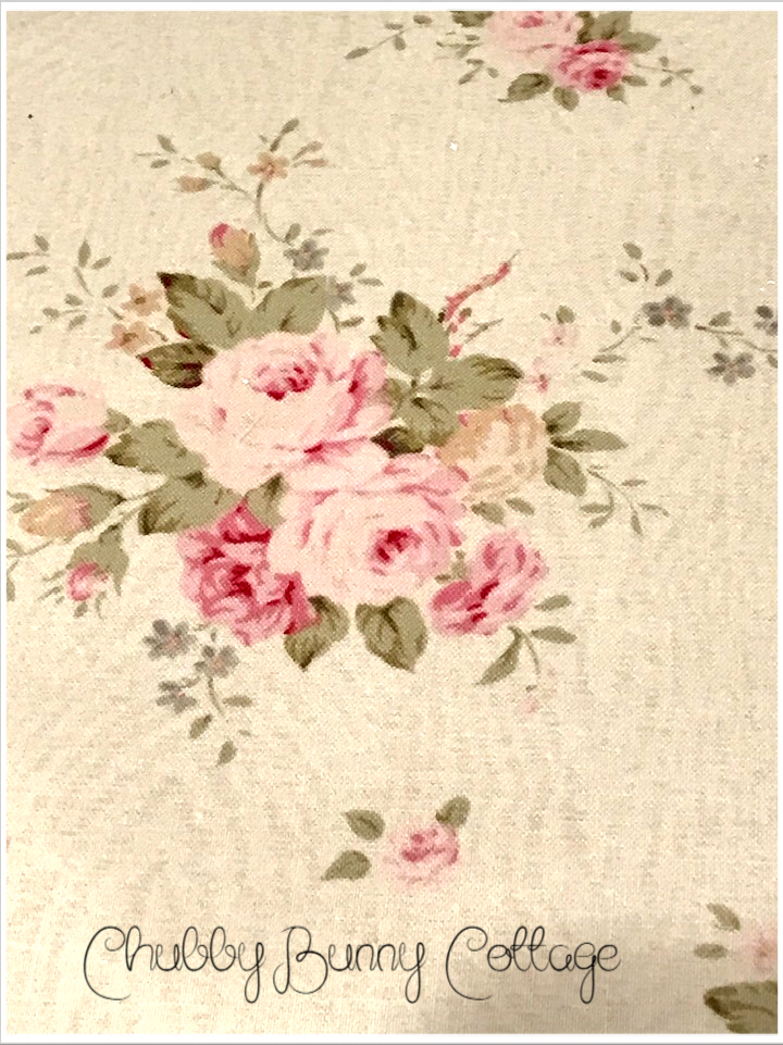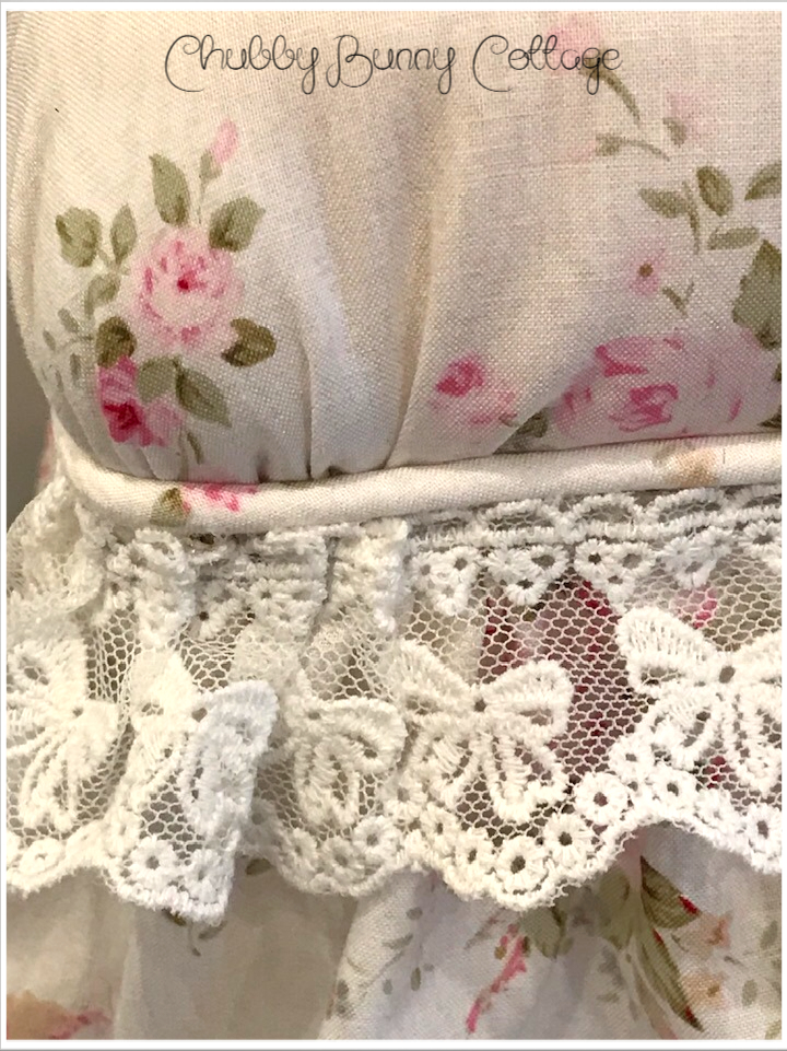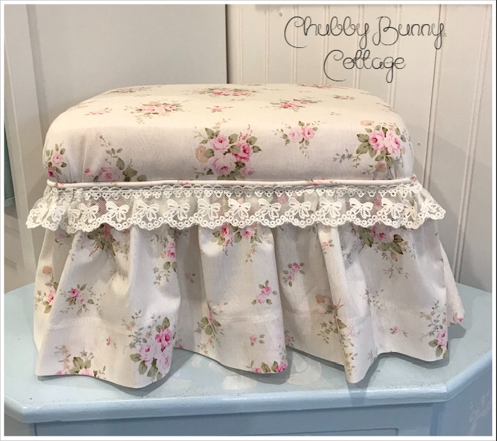 This is one of my precious little footstools. all handmade. it is covered in a pink rose bouquet print. the fabric is cotton and has a taffeta look background. it has a welt cord, ruffled skirt and a bow lace trim. the corners are gathered. it measures 12 1/2″ wide x 9 1/2″ deep and is 8 3/4″ tall. the top is a foam wrapped cushion; attached. it has white wood legs that do unscrew. handmade/one of a kind.
