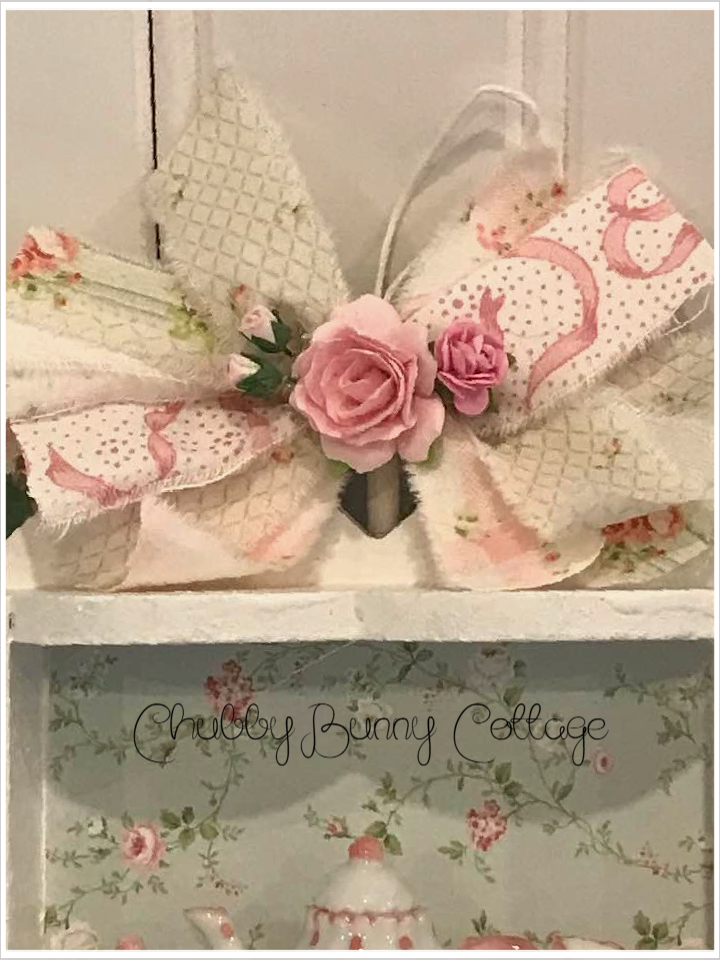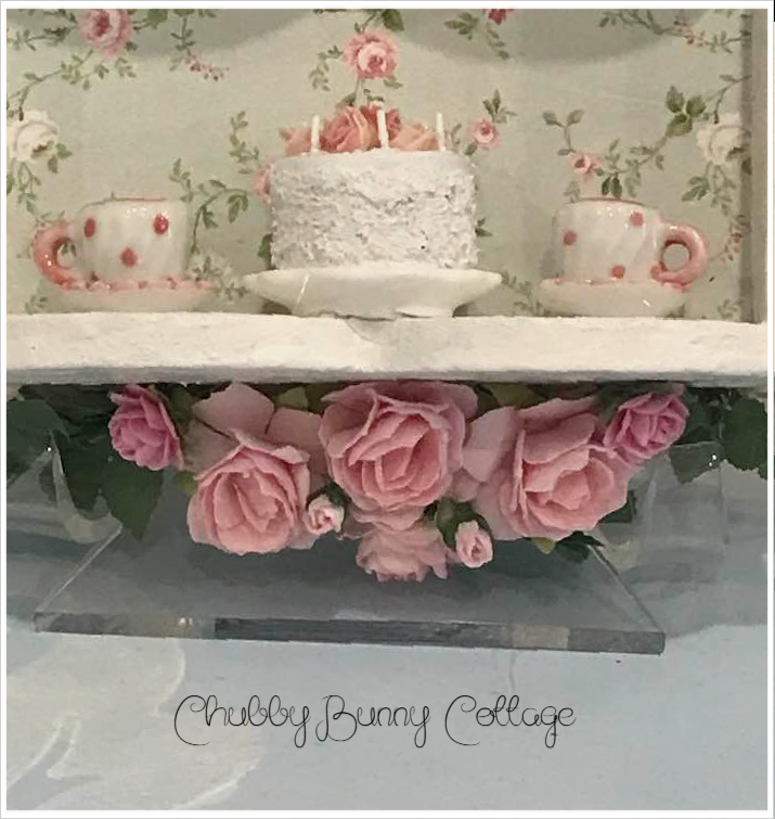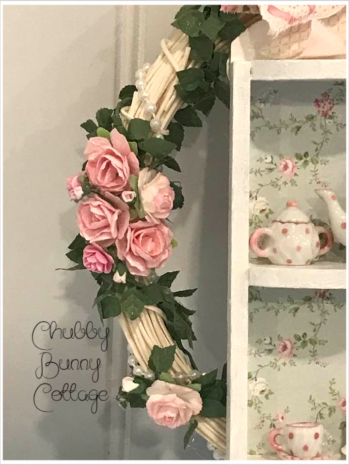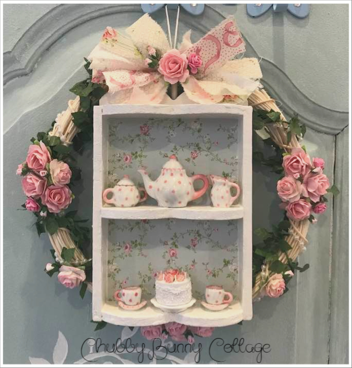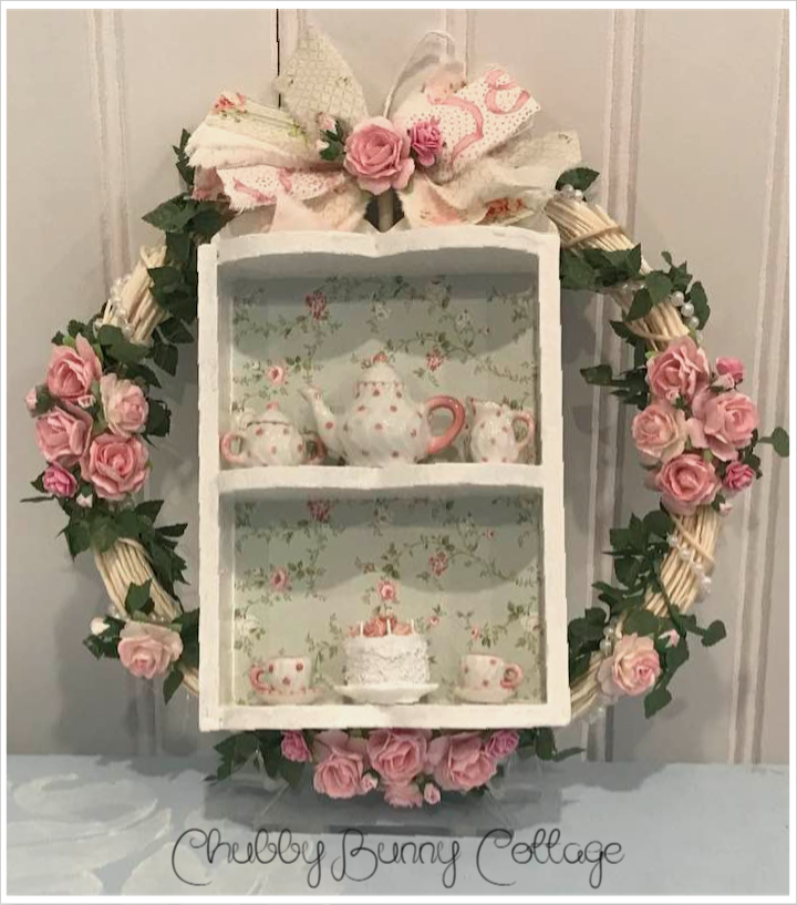 This is such a pretty little miniature tea set wreath. it features a little shelf that is painted white and backed inside with a light green with roses print. the miniature teaset is a hallmark vintage set with pink polka dots. it is wrapped with a mini green ivy and pearls. it is embellished with lots of pink paper roses and rose buds. it has a little rag bow at the top center. it has one of my cakes on the bottom shelf. this is an 8″ wicker wreath. it has a white string at the top for hanging. handmade/one of a kind.