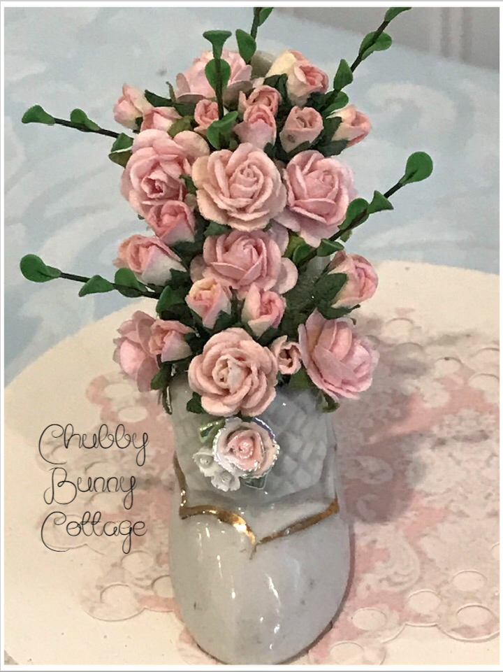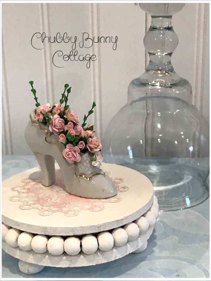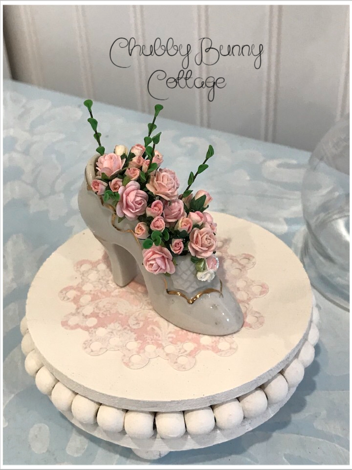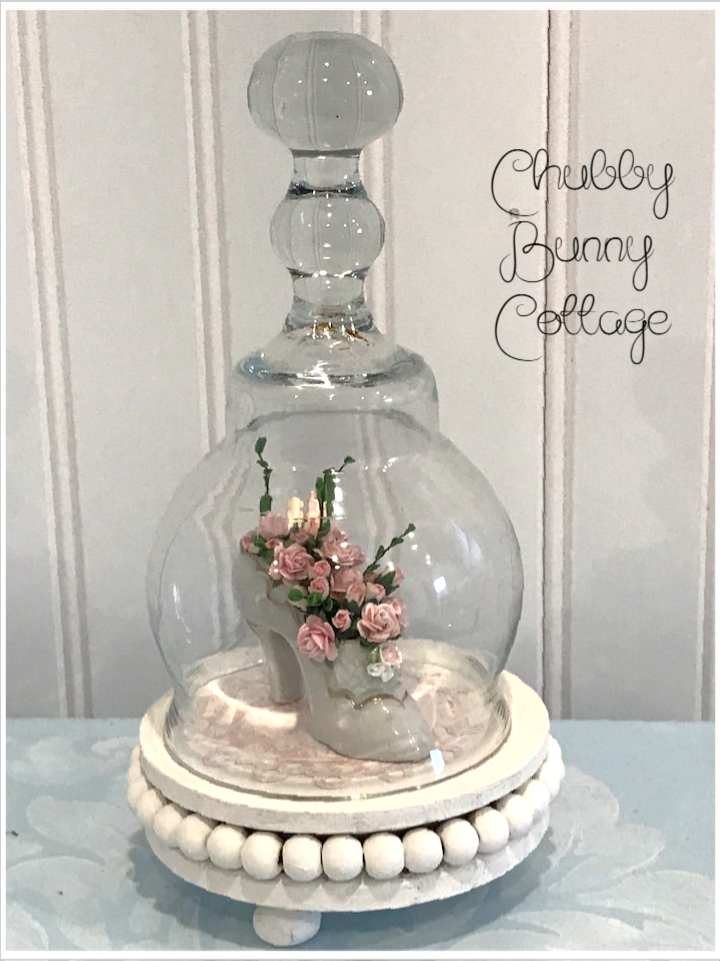 This pretty little ceramic shoe has a pink rose bouquet in a bell shaped glass cloche. it sits on a white wood bead footed pedestal. the shoe is marked A.Nat. Sup. Original. it measures 4″ in diameter and stands 8 1/4″ tall. the shoe measures 2 1/2″ x 2″ tall. made with vintage and new items. the bell cloche has a stain inside at the bottom of the handle (it’s not noticable and probably came from something that was in it made of metal). vintage/refurbished/handmade/one of a kind.