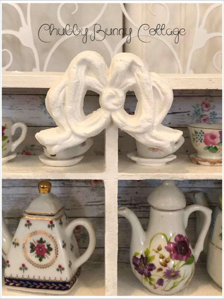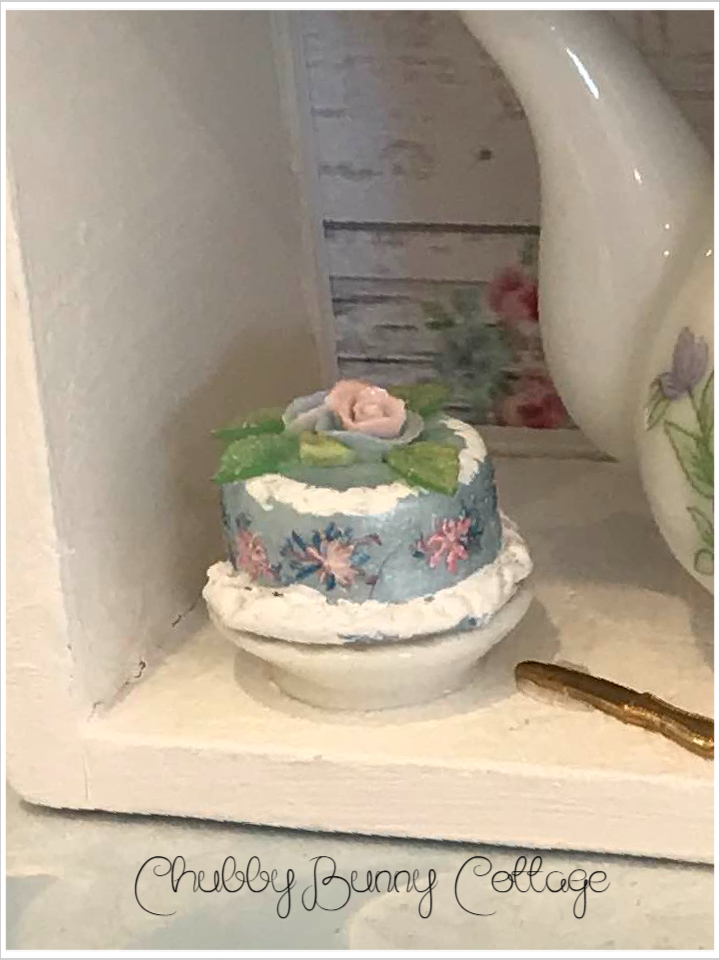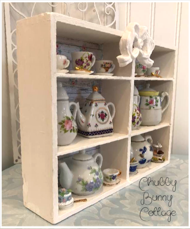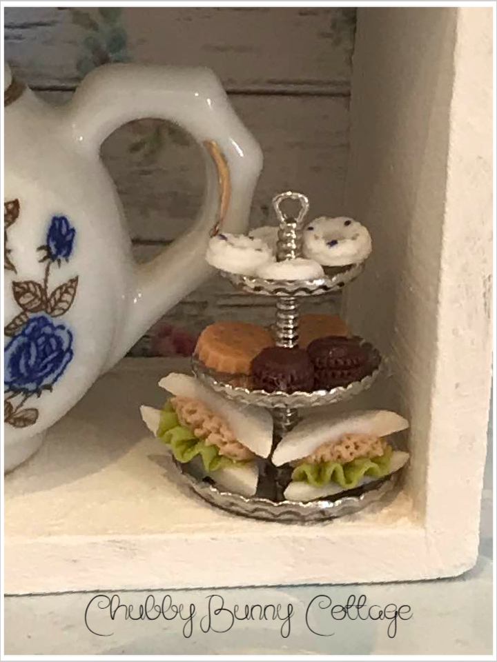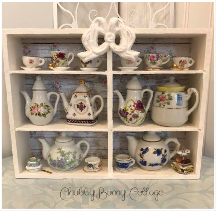 This sweet little shadow box contains 6 miniature teapots, 8 miniature tea cups, one of my cakes, and a tired plate of goodies. it has one of my handmade bows in the top center. all pieces are glued in place. made with vintage and new items. it is backed with a distressed shiplap with pink roses paper. it measures 10 1/2″ x 7 5/8″ and is 2 ” deep. this item sits table top. handmade/one of a kind.