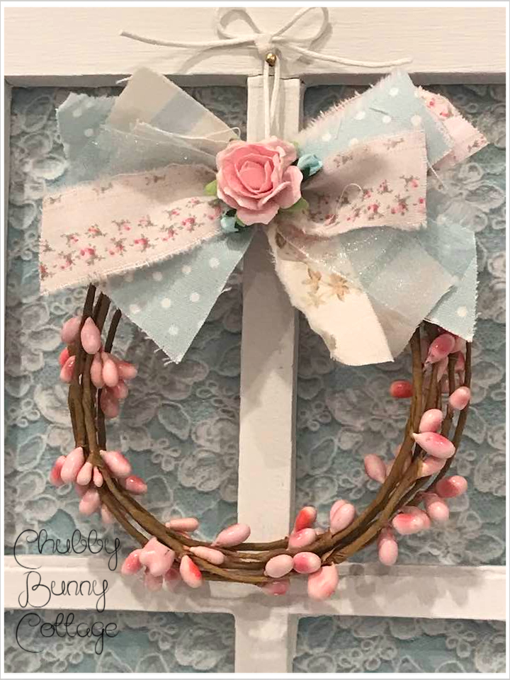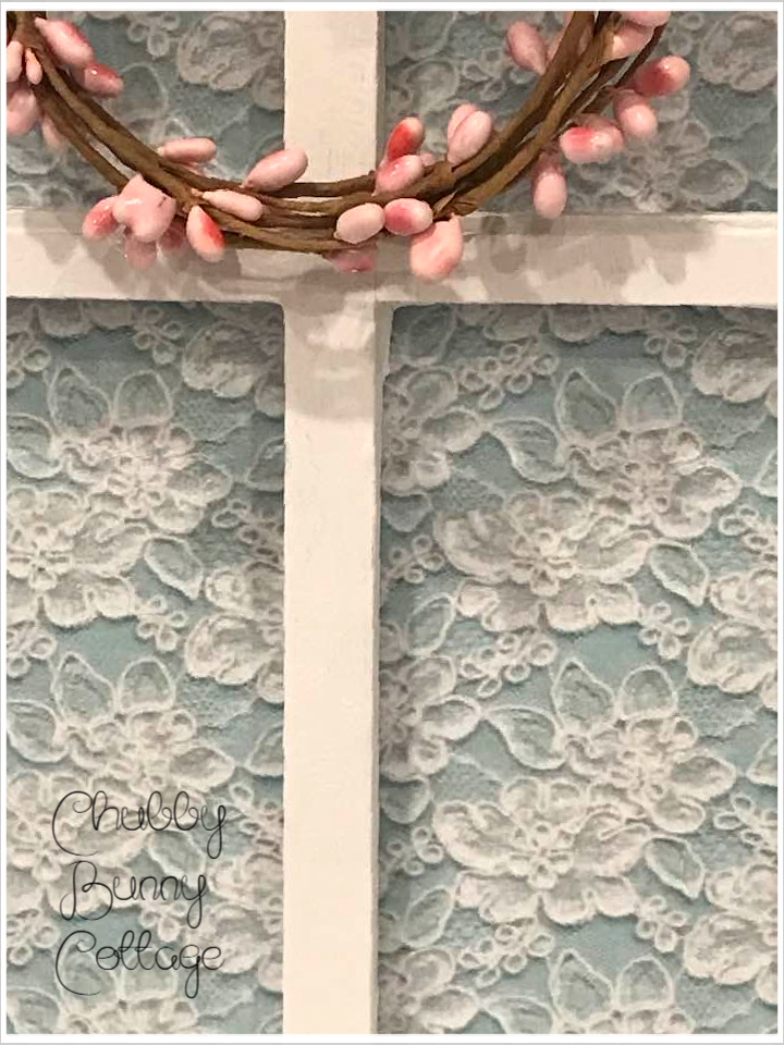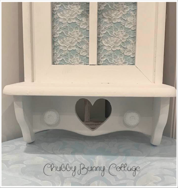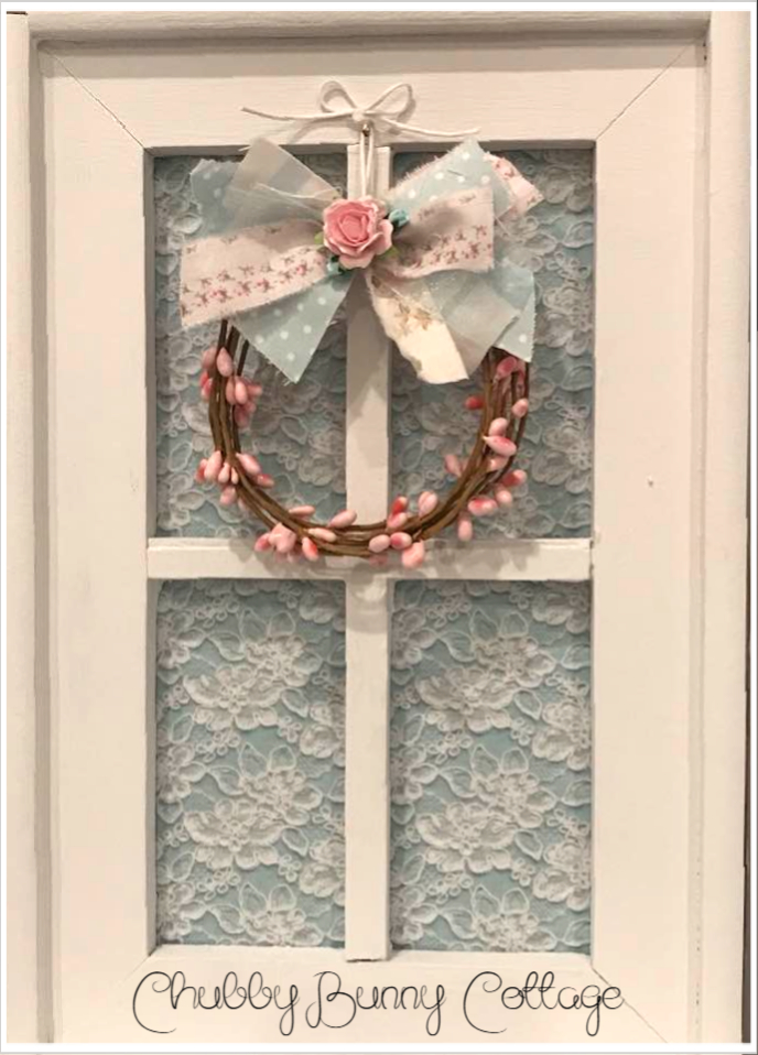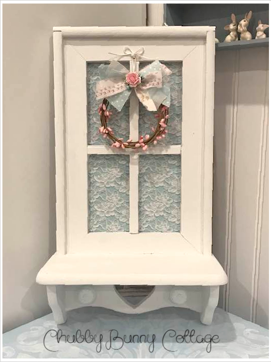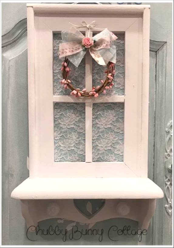 This is so pretty. it is a window shelf painted white. it has a light blue with lace overlay paper inside the window. it has a sweet little pink pip berry wreath with a shabby rag bow. it has a heart cut out at the bottom with 2 white metal knobs. it measures 9 1/2″ wide x 16 1/2″ tall. the shelf is 4″ deep. it has sawtooth hangers for hanging. vintage/refurbished/handmade/one of a kind.